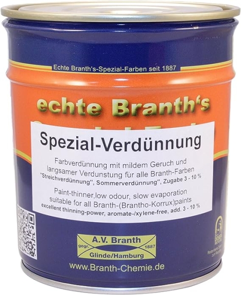 Die Branth's Spezialverdünnung, in einem praktischen 750 ml Eimer, bietet eine herausragende Verdünnungswirkung und zeichnet sich durch eine langsame Verdunstung aus, was sie deutlich stärker macht als herkömmliche Kunstharzverdünnungen oder Terpentin-Ersatzmittel. Sie ist frei von Aromaten und Xylol (WGK 1), was sie zu einer sicheren Wahl macht. Darüber hinaus trägt sie dazu bei, die Farbe länger offen zu halten und wird daher oft als Sommer- oder Streichverdünnung bezeichnet. Verlassen Sie sich auf die Qualität und Effektivität der Branth's Spezialverdünnung für Ihre Malerprojekte.