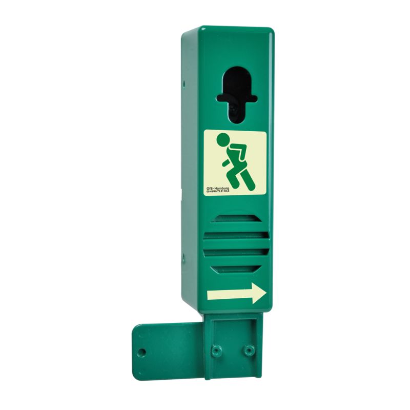 Der patentierte GfS Schwenk-Türwächter sichert die Tür, indem er das Betätigen des Türdrückers oder des Treibriegels verhindert. Um die Tür zu öffnen, muss der Türwächter zuerst zur Seite gedreht werden, wodurch er in einer Schrägstellung einrastet und den Betätigungsweg für die Klinke freigibt. Gleichzeitig wird ein lauter akustischer Alarm ausgelöst, der auf unbefugte Benutzung hinweist. Nur der verantwortliche Hausmeister oder Techniker kann den Alarm mit einem Schlüssel deaktivieren. Der Türwächter kann sowohl für rechte als auch für linke Türen verwendet werden, und Piktogramme auf ihm und der Tür zeigen die erforderliche Schwenkrichtung an. Die Schwenkrichtung kann mithilfe eines mitgelieferten Kerbstifts kundenseitig eingestellt werden.